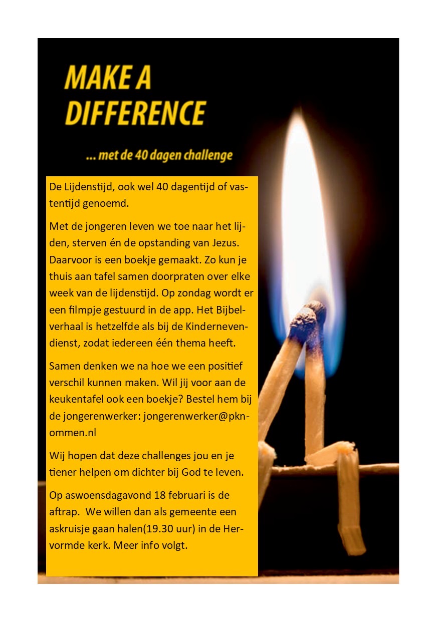 8 februari: start veertigdagentijd Kijk! Laat je verrassen door het werk van Gods Geest God Geest is altijd om ons heen. Hoe we Gods Geest ervaren in ons dagelijks leven is voor een ieder van ons anders. We zien Hem in de natuur om ons heen, we ervaren Hem in een fijn gesprek wat we hebben met een medemens... Hoe kunnen wij kijken door de ogen van God naar de wereld om ons heen in ons dagelijks leven? Tijdens de Aswoensdagdienst en de diensten in de Stille Week zullen we bij dit onderwerp stilstaan in het licht van het evangelie rondom Pasen. Wees welkom! Aswoensdag 18 februari 2026 om 19.30 uur in de Hervormde Kerk in Ommen. Dit jaar gaat de opbrengst van de collecte naar Hospice Ommen. Hospice Ommen beoogt een plek vol warmte en aandacht te zijn, waar mensen in hun laatste levensfase hulp, verzorging en begeleiding krijgen. In dit bijna-thuis-huis kan eenieder zich in een huiselijke omgeving op eigen wijze voorbereiden op het naderende afscheid. Steun Hospice Ommen om toekomstige gasten en hun naasten een zo fijn en comfortabel verblijf mogelijk te maken. Uw gift is van harte aanbevolen! |