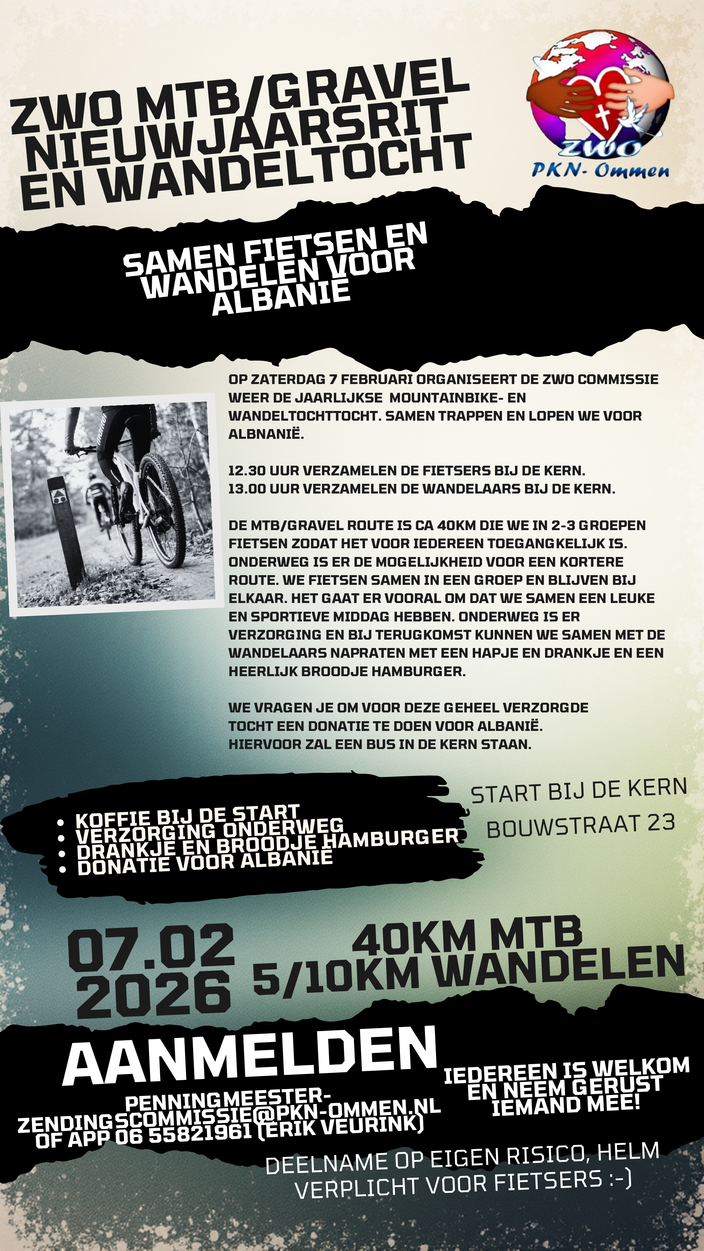 Op zaterdag 7 februari organiseert de ZWO commissie weer de jaarlijkse mountainbike- en wandeltochttocht. Samen trappen en lopen we voor Albanië. Om 12.30 uur verzamelen de fietsers bij De Kern. Om 13.00 uur verzamelen de wandelaars bij de Kern. De mtb/gravel route is ca 40 km. die we in 2-3 groepen fietsen zodat het voor iedereen toegankelijk is. Ook is er de mogelijkheid voor een kortere route. We fietsen samen in een groep en blijven bij elkaar. Het gaat er vooral om dat we samen een leuke en sportieve middag hebben. Onderweg is er verzorging en bij terugkomst kunnen we samen met de wandelaars napraten met een hapje en drankje en een heerlijk broodje hamburger. We vragen je om voor deze geheel verzorgde tocht een donatie te doen voor Albanië. Hiervoor zal een bus in De Kern staan. Aanmelden via penningmeester- ![]() | ||